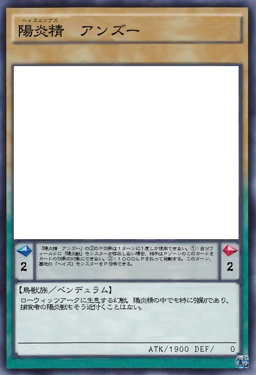 | 「陽炎精 アンズー」の②のP効果は1ターンに1度しか使用できない。①:自分フィールドに「陽炎獣」モンスターが存在しない場合、相手はPゾーンのこのカードをカードの効果の対象にできない。②:1000LPを払って発動する。このターン、墓地の「ヘイズ」モンスターをP召喚できる。 | |||
