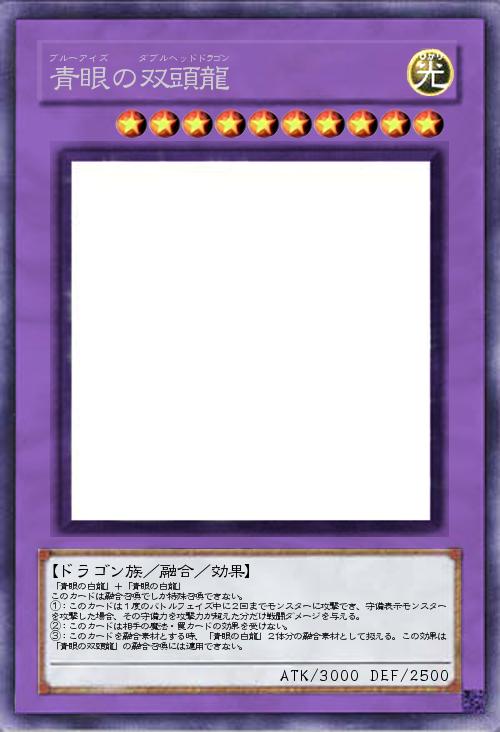 | 「青眼の白龍」+「青眼の白龍」 このカードは融合召喚でしか特殊召喚できない。 ①:このカードは1度のバトルフェイズ中に2回までモンスターに攻撃でき、守備表示モンスターを攻撃した場合、その守備力を攻撃力が超えた分だけ戦闘ダメージを与える。 ②:このカードは相手の魔法・罠カードの効果を受けない。 ③:このカードを融合素材とする時、「青眼の白龍」2体分の融合素材として扱える。この効果は「青眼の双頭龍」の融合召喚には適用できない。 | |||