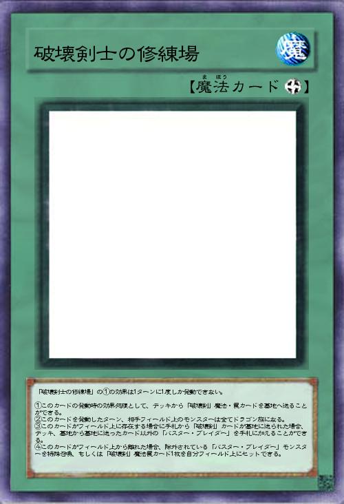 | 「破壊剣士の修練場」の①の効果は1ターンに1度しか発動できない。 ①このカードの発動時の効果処理として、デッキから「破壊剣」魔法・罠カードを墓地へ送ることができる。 ②このカードを発動したターン、相手フィールド上のモンスターは全てドラゴン族になる。 ③このカードがフィールド上に存在する場合に手札から「破壊剣」カードが墓地に送られた場合、デッキ、墓地から墓地に送ったカード以外の「バスター・ブレイダー」を手札に加えることができる。 ④このカードがフィールド上から離れた場合、除外されている「バスター・ブレイダー」モンスターを特殊召喚、もしくは「破壊剣」魔法罠カード1枚を自分フィールド上にセットできる。 | |||