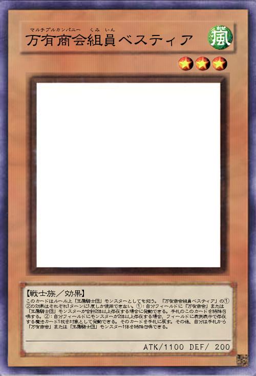 | このカードはルール上「王属騎士団」モンスターとしても扱う。「万有商会組員ベスティア」の①②の効果はそれぞれ1ターンに1度しか使用できない。①:自分フィールドに「万有商会」または「王属騎士団」モンスターが合計2体以上存在する場合に発動できる。手札のこのカードを特殊召喚する。②:自分フィールドにモンスターが2体以上存在する場合、フィールドに表側表示で存在する魔法カード1枚を対象として発動できる。そのカードを手札に戻す。その後、自分は手札から「万有商会」または「王属騎士団」モンスター1体を特殊召喚できる。 | |||