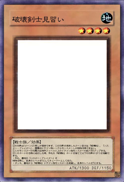 | ②の効果は1ターンに1度しか使用できず、この効果を使用したターン自分は「破壊剣」、「バスター・ブレイダー」、闇属性ドラゴン族シンクロモンスターしか特殊召喚できない。 ①このモンスターの攻撃力は相手フィールド上のドラゴン族モンスターの数×500アップする。 ②このカードの召喚に成功した時、手札の「破壊剣」カードを捨てて以下の効果から1つを発動できる。 ・手札、墓地の「バスター・ブレイダー」を 特殊召喚し、自身のレベルを1にしてチューナーとして扱う。 ・デッキ、墓地から「破壊剣」ドラゴン族モンスターを装備し、自身のレベルを7にする。 | |||