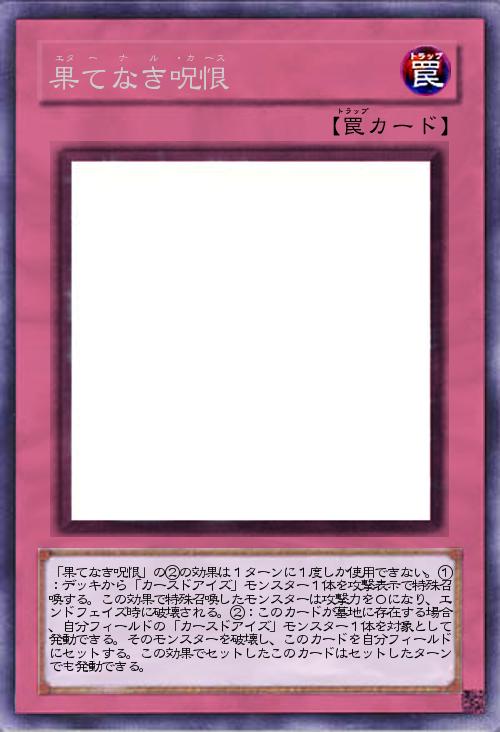 | 「果てなき呪恨」の②の効果は1ターンに1度しか使用できない。①:デッキから「カースドアイズ」モンスター1体を攻撃表示で特殊召喚する。この効果で特殊召喚したモンスターは攻撃力を0になり、エンドフェイズ時に破壊される。②:このカードが墓地に存在する場合、自分フィールドの「カースドアイズ」モンスター1体を対象として発動できる。そのモンスターを破壊し、このカードを自分フィールドにセットする。この効果でセットしたこのカードはセットしたターンでも発動できる。 | |||