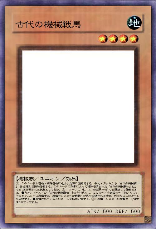 | ①:このカードが召喚・特殊召喚に成功した時に発動できる。手札・デッキから「古代の機械騎士」1体を選んで特殊召喚する。このカードの効果によって特殊召喚された「古代の機械騎士」は、もう1度召喚された状態として扱う。②:1ターンに1度、以下の効果から1つを選択して発動できる。●自分フィールドの「古代の機械騎士」1体を対象とし、このカードを装備カード扱いとしてそのモンスターに装備する。装備モンスターが戦闘・効果で破壊される場合、代わりにこのカードを破壊する。●装備されているこのカードを特殊召喚する。③:装備モンスターの攻撃力・守備力は500アップする。 | |||
