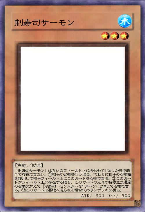 | 「制寿司サーモン」は互いのフィールド上に合わせて1体しか表側表示で存在できない。①相手が召喚を行う場合、代わりに相手の召喚権を使用して相手フィールド上にこのカードを召喚できる。②このカードがフィールド上に存在する限り、このカードの元々の持ち主は通常の召喚に加えて「制寿司」モンスターを1ターンに2体まで召喚できる。③このカードは墓地へ送られる場合代わりにデッキに戻る。 | |||