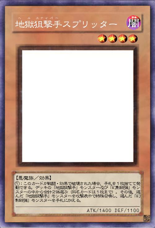 | ①:このカードが戦闘・効果で破壊された場合、手札を1枚捨てて発動できる。デッキの「地獄狙撃手」モンスター及び「幻影銃弾」モンスターの中から合計2体選ぶ(同名カードは1枚まで)。その後、選んだ「地獄狙撃手」モンスターを攻撃表示で特殊召喚し、選んだ「幻影銃弾」モンスターを手札に加える。 | |||