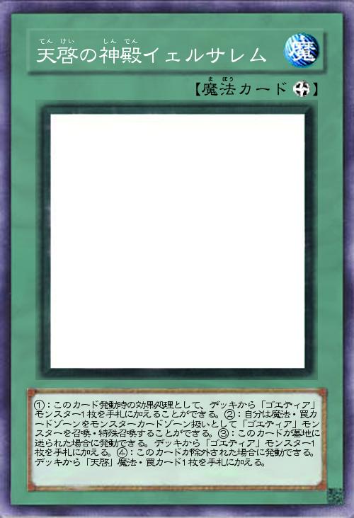 | ①:このカード発動時の効果処理として、デッキから「ゴエティア」モンスター1枚を手札に加えることができる。②:自分は魔法・罠カードゾーンをモンスターカードゾーン扱いとして「ゴエティア」モンスターを召喚・特殊召喚することができる。③:このカードが墓地に送られた場合に発動できる。デッキから「ゴエティア」モンスター1枚を手札に加える。④:このカードが除外された場合に発動できる。デッキから「天啓」魔法・罠カード1枚を手札に加える。 | |||