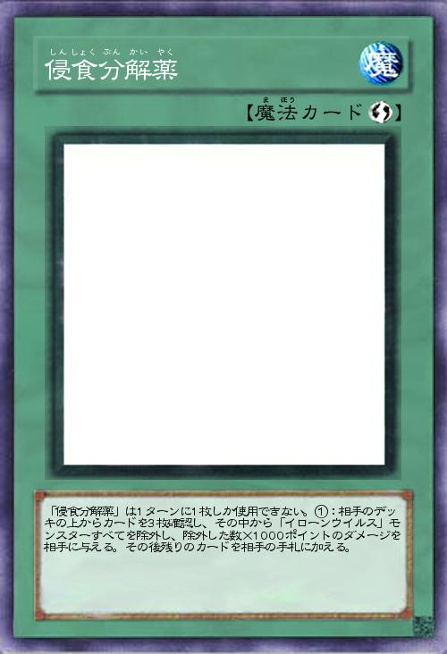 | 「侵食分解薬」は1ターンに1枚しか使用できない。①:相手のデッキの上からカードを3枚確認し、その中から「イローンウイルス」モンスターすべてを除外し、除外した数×1000ポイントのダメージを相手に与える。その後残りのカードを相手の手札に加える。 | |||