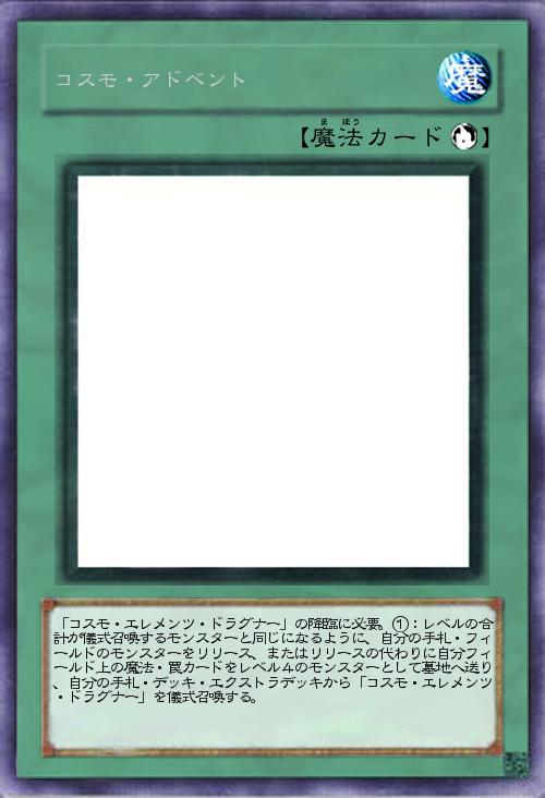 | 「コスモ・エレメンツ・ドラグナー」の降臨に必要。①:レベルの合計が儀式召喚するモンスターと同じになるように、自分の手札・フィールドのモンスターをリリース、またはリリースの代わりに自分フィールド上の魔法・罠カードをレベル4のモンスターとして墓地へ送り、自分の手札・デッキ・エクストラデッキから「コスモ・エレメンツ・ドラグナー」を儀式召喚する。 | |||
