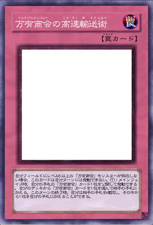| 自分フィールドにレベル5以上の「万有商会」モンスターが存在しない場合、このカードは自分ターンには発動できない。①:メインフェイズ時、自分の手札の「万有商会」カード1枚を公開して発動できる。自分のデッキから「万有商会」カードを1枚を選んで相手の手札に加える。このターンの終了時、自分は相手の手札を確認し、その中から1枚を自分の手札に加えることができる。 | |||