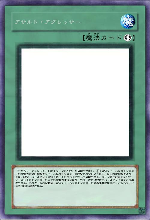 | 「アサルト・アグレッサー」は1ターンに1枚しか発動できない。①:自分フィールドのモンスターの攻撃力の合計が相手フィールドのモンスターの攻撃力の合計より低く、自分のLPが相手より少ない場合、バトルフェイズ終了時、1000LPを払って発動できる。ターン終了時まで自分フィールド上のモンスターの元々の攻撃力は倍になり、もう一度だけ続けてバトルフェイズを行う事ができる。このカードの発動後、自分フィールドのモンスターの効果は無効化され、バトルフェイズ終了時に破壊される。 | |||