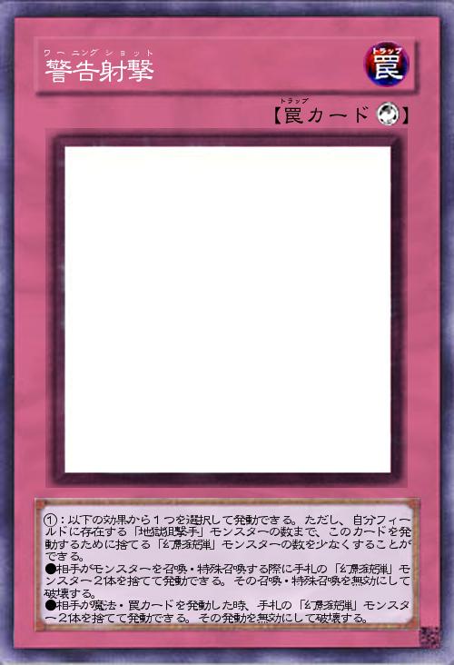 | ①:以下の効果から1つを選択して発動できる。ただし、自分フィールドに存在する「地獄狙撃手」モンスターの数まで、このカードを発動するために捨てる「幻影銃弾」モンスターの数を少なくすることができる。 ●相手がモンスターを召喚・特殊召喚する際に手札の「幻影銃弾」モンスター2体を捨てて発動できる。その召喚・特殊召喚を無効にして破壊する。 ●相手が魔法・罠カードを発動した時、手札の「幻影銃弾」モンスター2体を捨てて発動できる。その発動を無効にして破壊する。 | |||