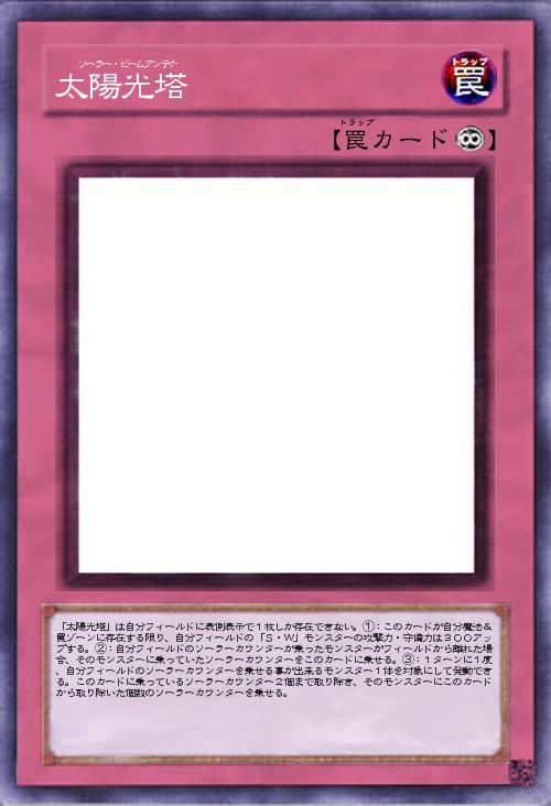 | 「太陽光塔」は自分フィールドに表側表示で1枚しか存在できない。①:このカードが自分魔法&罠ゾーンに存在する限り、自分フィールドの「S・W」モンスターの攻撃力・守備力は300アップする。②:自分フィールドのソーラーカウンターが乗ったモンスターがフィールドから離れた場合、そのモンスターに乗っていたソーラーカウンターをこのカードに乗せる。③:1ターンに1度、自分フィールドのソーラーカウンターを乗せる事が出来るモンスター1体を対象にして発動できる。このカードに乗っているソーラーカウンター2個まで取り除き、そのモンスターにこのカードから取り除いた個数のソーラーカウンターを乗せる。 | |||