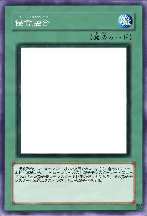 | 「侵食融合」は1ターンに1枚しか使用できない。①:自分のフィールド・墓地から、「イローンウイルス」融合モンスターカードによって決められた融合素材モンスターを相手のデッキに加え、その融合モンスター1体をエクストラデッキから融合召喚する。 | |||