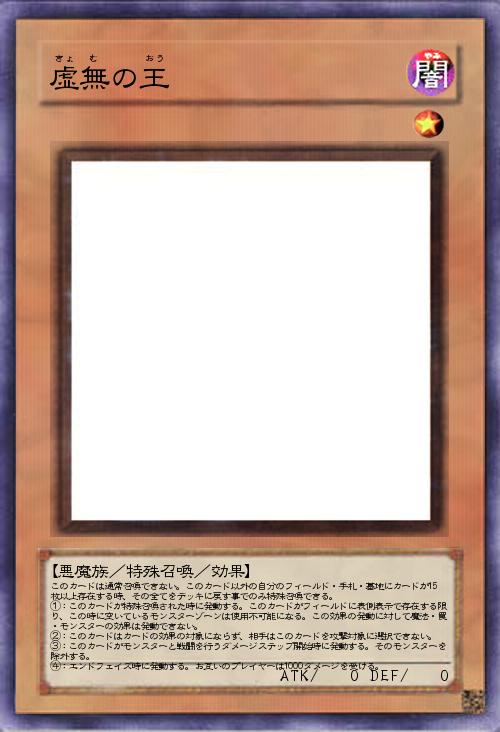 | このカードは通常召喚できない。このカード以外の自分のフィールド・手札・墓地にカードが15枚以上存在する時、その全てをデッキに戻す事でのみ特殊召喚できる。 ①:このカードが特殊召喚された時に発動する。このカードがフィールドに表側表示で存在する限り、この時に空いているモンスターゾーンは使用不可能になる。この効果の発動に対して魔法・罠・モンスターの効果は発動できない。 ②:このカードはカードの効果の対象にならず、相手はこのカードを攻撃対象に選択できない。 ③:このカードがモンスターと戦闘を行うダメージステップ開始時に発動する。そのモンスターを除外する。 ④:エンドフェイズ時に発動する。お互いのプレイヤーは1000ダメージを受ける。 | |||