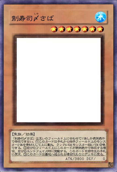 | 「制寿司〆さば」は互いのフィールド上に合わせて1体しか表側表示で存在できない。①このカードは手札から相手フィールド上のモンスター2体を素材として上に重ね、ランク4のXモンスター扱いでX召喚できる。②自分のフィールド上にこのカードが表側表示で存在する場合、自分のエンドフェイズ時に発動する。このカードを持ち主の手札に戻す。③このカードは墓地へ送られる場合代わりにデッキに戻る。 | |||