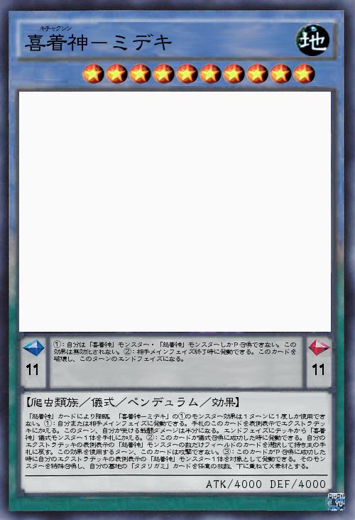| 「怒着神」カードにより降臨。「喜着神-ミデキ」の①のモンスター効果は1ターンに1度しか使用できない。①:自分または相手メインフェイズに発動できる。手札のこのカードを表側表示でエクストラデッキに加える。このターン、自分が受ける戦闘ダメージは半分になる。エンドフェイズにデッキから「喜着神」儀式モンスター1体を手札に加える。②:このカードが儀式召喚に成功した時に発動できる。自分のエクストラデッキの表側表示の「怒着神」モンスターの数だけフィールドのカードを選択して持ち主の手札に戻す。この効果を使用するターン、このカードは攻撃できない。③:このカードがP召喚に成功した時に自分のエクストラデッキの表側表示の「怒着神」モンスター1体を対象として発動できる。そのモンスターを特殊召喚し、自分の墓地の「タタリガミ」カードを任意の枚数、下に重ねてX素材とする。 | |||