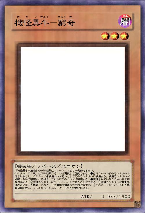 | 「機怪異牛-窮奇」の④の効果は1ターンに1度しか発動できない。 ①1ターンに1度、以下の効果から1つを選択して発動できる。●自分フィールドのモンスター1体を対象とし、このカードを装備カード扱いとしてそのモンスターに装備する。装備モンスターが戦闘・効果で破壊される場合、代わりにこのカードを破壊する。●装備されているこのカードを特殊召喚する。②装備モンスターはチューナーとして扱うことができる。③装備モンスターが裏側守備表示になった場合、このカードを裏側守備表示で特殊召喚する。④このカードがリバースした場合発動できる。デッキからモンスターカードを1枚墓地に送る。 | |||