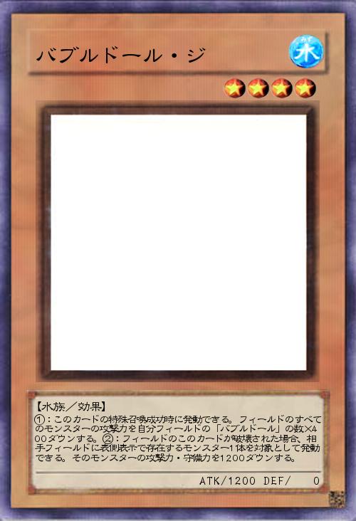 | ①:このカードの特殊召喚成功時に発動できる。フィールドのすべてのモンスターの攻撃力を自分フィールドの「バブルドール」の数×400ダウンする。②:フィールドのこのカードが破壊された場合、相手フィールドに表側表示で存在するモンスター1体を対象として発動できる。そのモンスターの攻撃力・守備力を1200ダウンする。 | |||