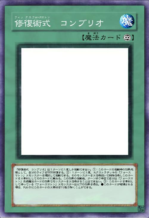 | 「修復術式 コンブリオ」は1ターンに1度しか発動できない。①:このカードの発動時の効果処理として、自分のライフを1000回復する。②:1ターンに1度、エクストラデッキの「フォースマトン」Xモンスターを選択して発動できる。そのモンスターをX召喚扱いで特殊召喚しこのカードをX素材としてそのカードに重ねる。この効果の発動後、ターン終了時まで自分は「フォースマトン」永続魔法カードの効果でモンスターをX召喚することはできない。③:このカードを素材として持っている「フォースマトン」Xモンスターは以下の効果を得る。●このカードが破壊される場合、代わりにこのカードのX素材を1つ取り除くことができる。 | |||