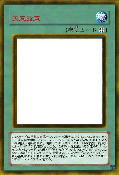 | このカードは手札の天真モンスターを墓地におくることによってセット、または発動をできる。フィールド上のレベルのない天真モンスターを選択し発動できる、選択したモンスターのレベルを指定し指定したレベルにになり闇属性となる。この効果発動後、次の自分のターンまで自分はカードの効果を発動するたび指定したレベルの1レべルにつき200ポイントのダメージを受ける。このカードがフィールド上から墓地におくられたとき、指定したレベル1レベルにつき300ポイントライフを回復する。 | |||