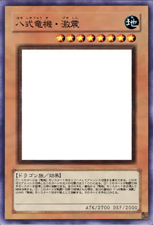 | ①:このカードは「竜機」モンスター1体をリリースしてアドバンス召喚する事もできる。この方法でアドバンス召喚したこのカードの元々の攻撃力は2100になる。②:このカードが戦闘で相手モンスターを破壊した時に発動できる。自分の手札・墓地から「竜機」モンスター1体を選んで特殊召喚する。③:このカードが戦闘・効果で破壊された場合、自分の墓地の「八式竜機・激震」以外の「竜機」モンスター1体を対象として発動する。そのカードを手札に加える。 | |||