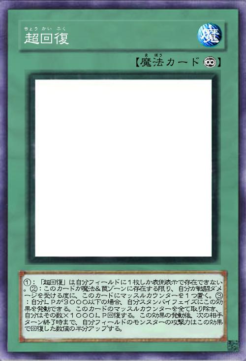 | ①:「超回復」は自分フィールドに1枚しか表側表示で存在できない。②:このカードが魔法&罠ゾーンに存在する限り、自分が戦闘ダメージを受ける度に、このカードにマッスルカウンターを1つ置く。③:自分LPが3000以下の場合、自分スタンバイフェイズにこの効果を発動できる。このカードのマッスルカウンターを全て取り除き、自分はその数×1000LP回復する。この効果の発動後、次の相手ターン終了時まで、自分フィールドのモンスターの攻撃力はこの効果で回復した数値の半分アップする。 | |||