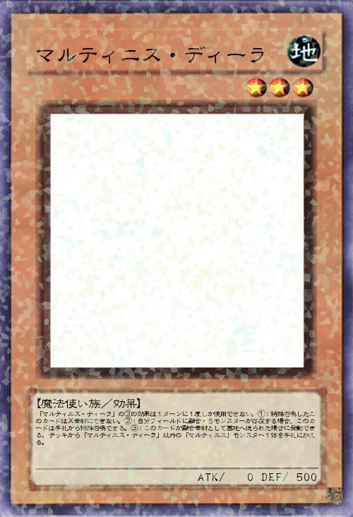 | 「マルティニス・ディーラ」の③の効果は1ターンに1度しか使用できない。①:特殊召喚したこのカードはⅩ素材にできない。②:自分フィールドに融合・Sモンスターが存在する場合、このカードは手札から特殊召喚できる。③:このカードが融合素材として墓地へ送られた場合に発動できる。デッキから「マルティニス・ディーラ」以外の「マルティニス」モンスター1体を手札に加える。 | |||