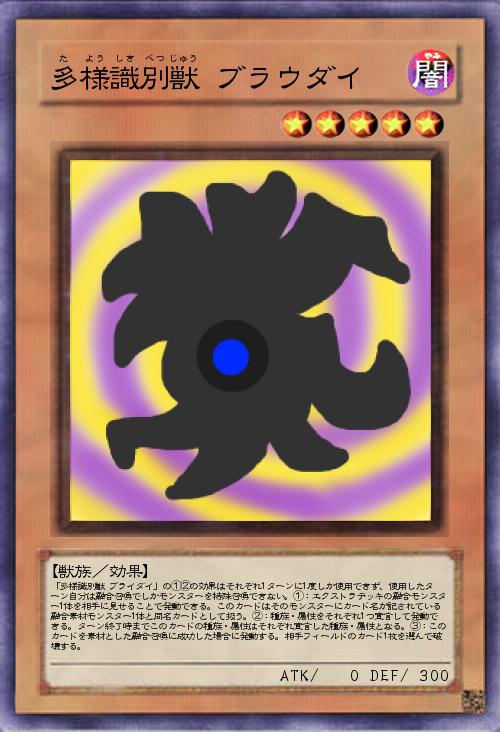 | 「多様識別獣 ブライダイ」の①②の効果はそれぞれ1ターンに1度しか使用できず、使用したターン自分は融合召喚でしかモンスターを特殊召喚できない。①:エクストラデッキの融合モンスター1体を相手に見せることで発動できる。このカードはそのモンスターにカード名が記されている融合素材モンスター1体と同名カードとして扱う。②:種族・属性をそれぞれ1つ宣言して発動できる。ターン終了時までこのカードの種族・属性はそれぞれ宣言した種族・属性となる。③:このカードを素材とした融合召喚に成功した場合に発動する。相手フィールドのカード1枚を選んで破壊する。 | |||