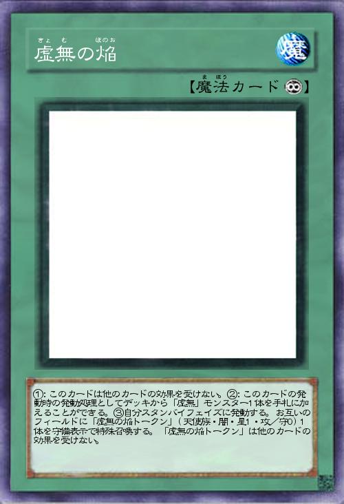 | ①:このカードは他のカードの効果を受けない。②:このカードの発動時の発動処理としてデッキから「虚無」モンスター1体を手札に加えることができる。③自分スタンバイフェイズに発動する。お互いのフィールドに「虚無の焔トークン」(天使族・闇・星1・攻/守0)1体を守備表示で特殊召喚する。「虚無の焔トークン」は他のカードの効果を受けない。 | |||