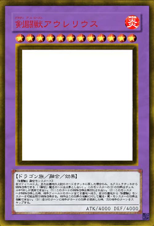 | 「剣闘獣」融合モンスター×3 自分フィールド上、または墓地の上記のカードをデッキに戻した場合のみ、エクストラデッキから特殊召喚できる(「融合」魔法カードは必要としない)。このモンスターの(3)の効果はデュエル中1回しか使用できない。(1):このカードの特殊召喚は無効化されない。(2):このモンスターが特殊召喚した時、相手フィールドのカード全てを墓地へ送り、自分の墓地から「剣闘獣」モンスターを可能な限り特殊召喚する。相手はこの効果の発動に対して魔法・罠・モンスターの効果は発動できない。(3):自分のターンに相手がカードの効果を使用した時、次の相手のターンをスキップする。 | |||
