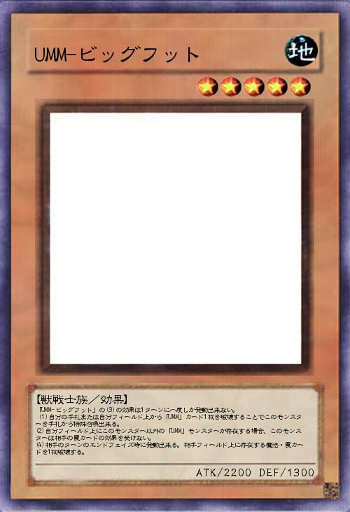 | 「UMM-ビッグフット」の(3)の効果は1ターンに一度しか発動出来ない。 (1)自分の手札または自分フィールド上から「UMM」カード1枚を破壊することでこのモンスターを手札から特殊召喚出来る。 (2)自分フィールド上にこのモンスター以外の「UMM」モンスターが存在する場合、このモンスターは相手の罠カードの効果を受けない。 (4)相手のターンのエンドフェイズ時に発動出来る。相手フィールド上に存在する魔法・罠カードを1枚破壊する。 | |||