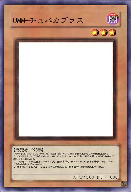 | 「UMM-チュパカブラス」の(1)(3)の効果は1ターンにそれぞれ一度ずつしか発動出来ない。 (1)このモンスターが召喚に成功した時、自分のデッキから「UMM」魔法・罠カードを1枚手札に加えることが出来る。 (2)このモンスターは自分フィールド上に他の「UMM」モンスターが存在する場合、相手のカードの効果の対象にならない。 (3)相手のターンのエンドフェイズ時に発動出来る。相手は手札を1枚選び墓地へ送る。 | |||