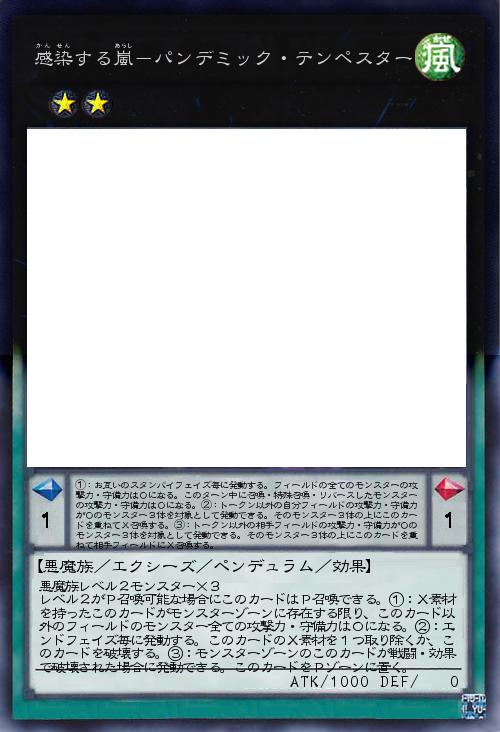「コントロール色の強いカードにしてみた。テーマは攻守0で、他のモンスターの攻守を奪いながら、ペンデュラムから攻守0のモンスターを素材にして自分・相手のフィールドにエクシーズ召喚する効果があります。