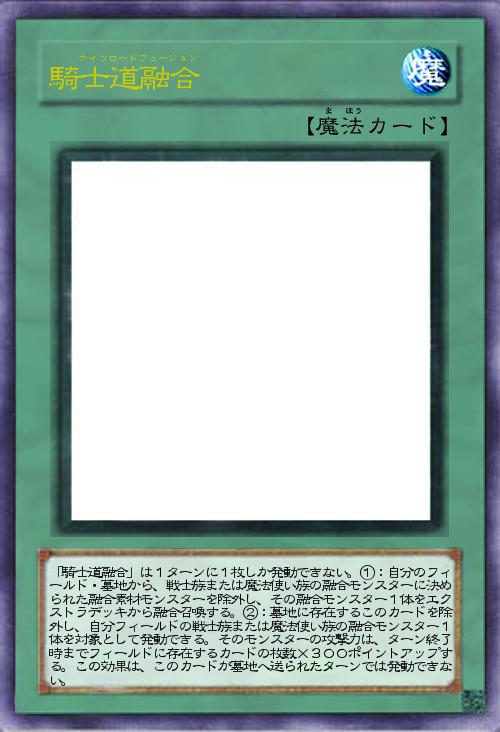 | 「騎士道融合」は1ターンに1枚しか発動できない。①:自分のフィールド・墓地から、戦士族または魔法使い族の融合モンスターに決められた融合素材モンスターを除外し、その融合モンスター1体をエクストラデッキから融合召喚する。②:墓地に存在するこのカードを除外し、自分フィールドの戦士族または魔法使い族の融合モンスター1体を対象として発動できる。そのモンスターの攻撃力は、ターン終了時までフィールドに存在するカードの枚数×300ポイントアップする。この効果は、このカードが墓地へ送られたターンでは発動できない。 | |||