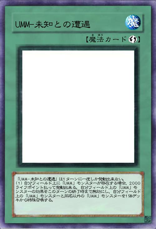 | 「UMM-未知との遭遇」は1ターンに一度しか発動出来ない。 (1)自分フィールド上に「UMM」モンスターが存在する場合、2000ライフポイント払って発動出来る。自分フィールド上の「UMM」モンスターの効果をこのターンの終了時まで無効にし、自分フィールド上の「UMM」モンスターと同名以外の「UMM」モンスターを1体デッキから特殊召喚する。 | |||