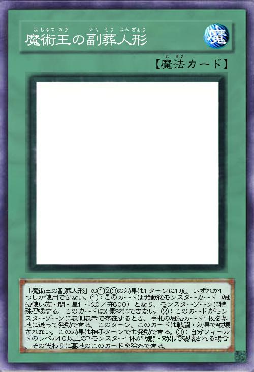 | 「魔術王の副葬人形」の①②③の効果は1ターンに1度、いずれか1つしか使用できない。①:このカードは発動後モンスターカード(魔法使い族・闇・星1・攻0/守800)となり、モンスターゾーンに特殊召喚する。このカードはX素材にできない。②:このカードがモンスターゾーンに表側表示で存在するとき、手札の魔法カード1枚を墓地に送って発動できる。このターン、このカードは戦闘・効果で破壊されない。この効果は相手ターンでも発動できる。③:自分フィールドのレベル10以上のPモンスター1体が戦闘・効果で破壊される場合、その代わりに墓地のこのカードを除外できる。 | |||