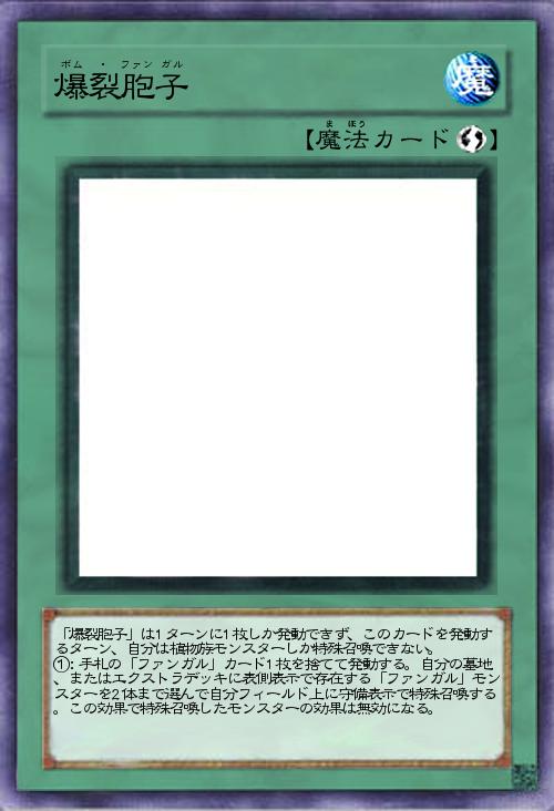 | 「爆裂胞子」は1ターンに1枚しか発動できず、このカードを発動するターン、自分は植物族モンスターしか特殊召喚できない。 ①:手札の「ファンガル」カード1枚を捨てて発動する。自分の墓地、またはエクストラデッキに表側表示で存在する「ファンガル」モンスターを2体まで選んで自分フィールド上に守備表示で特殊召喚する。この効果で特殊召喚したモンスターの効果は無効になる。 | |||