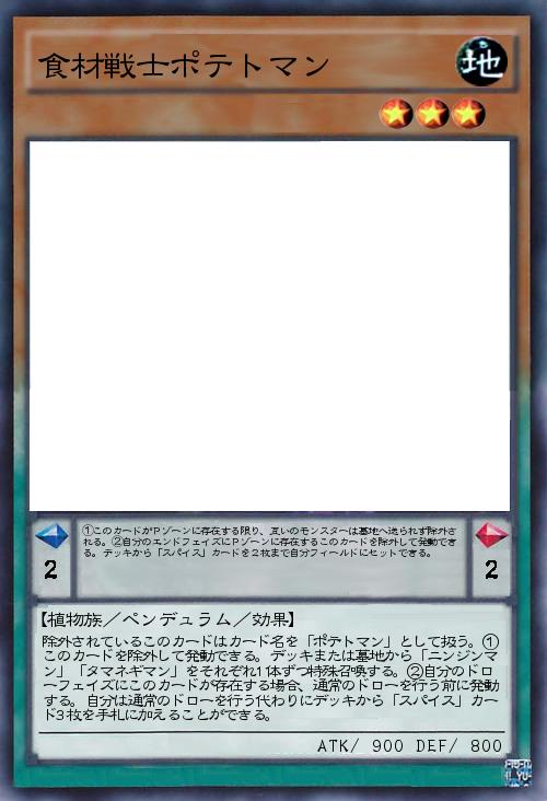 | 除外されているこのカードはカード名を「ポテトマン」として扱う。①このカードを除外して発動できる。デッキまたは墓地から「ニンジンマン」「タマネギマン」をそれぞれ1体ずつ特殊召喚する。②自分のドローフェイズにこのカードが存在する場合、通常のドローを行う前に発動する。自分は通常のドローを行う代わりにデッキから「スパイス」カード3枚を手札に加えることができる。 | |||