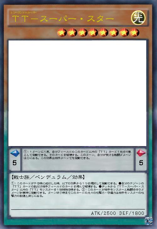 | ①:このカードがP召喚に成功した時、以下の効果から1つを選択して発動できる。●自分のPゾーンの「TT」カードの数だけ相手フィールドのカードを選んで破壊する。●デッキから「TT-スーパー・スター」以外の「TT」モンスターを1体特殊召喚する。②:このカードが相手モンスターと戦闘を行うダメージ計算時に発動できる。ターン終了時までこのカードの元々の攻撃力・守備力は相手モンスターの攻撃力の数値と同じになる。 | |||