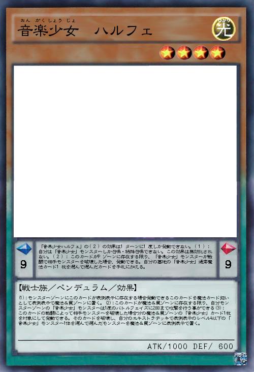 | 「音楽少女ハルフェ」の(2)の効果は1ターンに1度しか発動できない。(1):自分は「音楽少女」モンスターしか召喚・特殊召喚できない。この効果は無効化されない。(2):このカードがPゾーンに存在する限り、「音楽少女」モンスターが戦闘で相手モンスターを破壊した場合、発動できる。自分の墓地の「音楽少女」通常魔法カード1枚を選んで選んだカードを手札に加える。 | |||