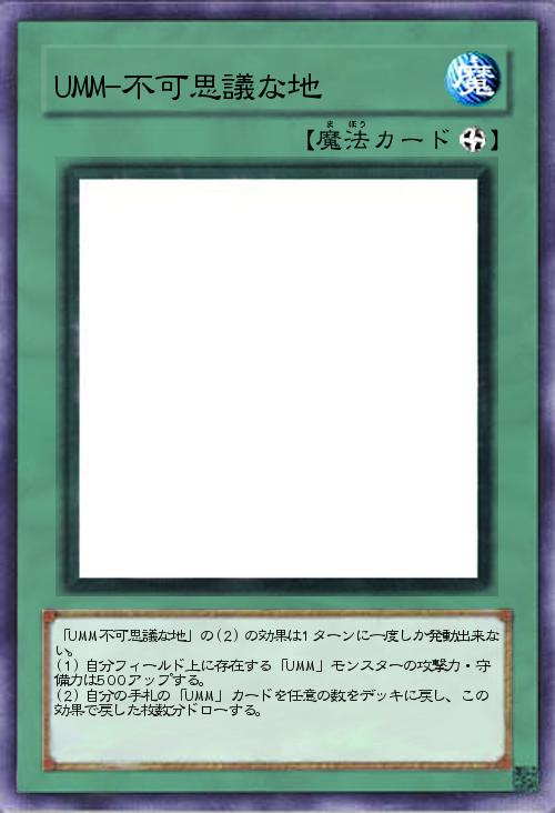 | 「UMM不可思議な地」の(2)の効果は1ターンに一度しか発動出来ない。 (1)自分フィールド上に存在する「UMM」モンスターの攻撃力・守備力は500アップする。 (2)自分の手札の「UMM」カードを任意の数をデッキに戻し、この効果で戻した枚数分ドローする。 | |||