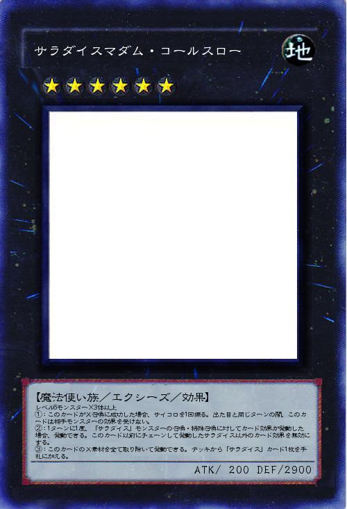 | レベル6モンスター×3体以上 ①:このカードがX召喚に成功した場合、サイコロを1回振る。出た目と同じターンの間、このカードは相手モンスターの効果を受けない。 ②:1ターンに1度、「サラダイス」モンスターの召喚・特殊召喚に対してカード効果が発動した場合、発動できる。このカード以前にチェーンして発動したサラダイス以外のカード効果を無効にする。 ③:このカードのX素材を全て取り除いて発動できる。デッキから「サラダイス」カード1枚を手札に加える。 | |||
