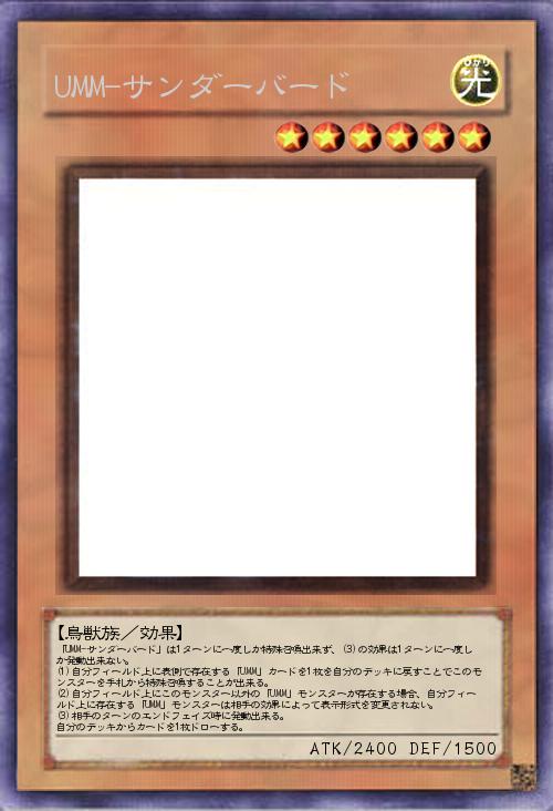 | 「UMM-サンダーバード」は1ターンに一度しか特殊召喚出来ず、(3)の効果は1ターンに一度しか発動出来ない。 (1)自分フィールド上に表側で存在する「UMM」カードを1枚を自分のデッキに戻すことでこのモンスターを手札から特殊召喚することが出来る。 (2)自分フィールド上にこのモンスター以外の「UMM」モンスターが存在する場合、自分フィールド上に存在する「UMM」モンスターは相手の効果によって表示形式を変更されない。 (3)相手のターンのエンドフェイズ時に発動出来る。 自分のデッキからカードを1枚ドローする。 | |||