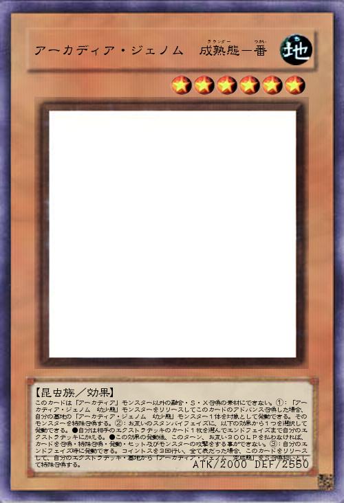 | このカードは「アーカディア」モンスター以外の融合・S・X召喚の素材にできない。①:「アーカディア・ジェノム 幼少態」モンスターをリリースしてこのカードのアドバンス召喚した場合、自分の墓地の「アーカディア・ジェノム 幼少態」モンスター1体を対象として発動できる。そのモンスターを特殊召喚する。②:お互いのスタンバイフェイズに、以下の効果から1つを選択して発動できる。●自分は相手のエクストラデッキのカード1枚を選んでエンドフェイズまで自分のエクストラデッキに加える。●この効果の発動後、このターン、お互い300LPを払わなければ、カードを召喚・特殊召喚・発動・セット及びモンスターの攻撃をする事ができない。③:自分のエンドフェイズ時に発動できる。コイントスを3回行い、全て表だった場合、このカードをリリースして、自分のエクストラデッキ・墓地から「アーカディア・ジェノム 完成態」をS召喚扱いとして特殊召 | |||