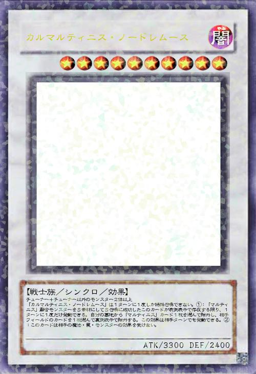 | チューナー+チューナー以外のモンスター2体以上 「カルマルティニス・ノードレムース」は1ターンに1度しか特殊召喚できない。①:「マルティニス」融合モンスターをS素材にしてS召喚に成功したこのカードが表側表示で存在する限り、1ターンに1度だけ発動できる。自分の墓地から「マルティニス」カード1枚を選んで除外し、相手フィールドのカードを1枚選んで裏側表示で除外する。この効果は相手ターンでも発動できる。②:このカードは相手の魔法・罠・モンスターの効果を受けない。 | |||