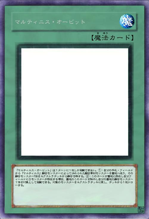 | 「マルティニス・オービット」は1ターンに1枚しか発動できない。①:自分の手札・フィールドから「マルティニス」融合モンスターによって決められた融合素材モンスターを墓地へ送り、その融合モンスター1体をエクストラデッキから融合召喚する。②:このカードが墓地に存在し自分フィールドにSモンスターが存在する場合、墓地のこのカードを除外し自分の墓地の融合モンスター1体を対象として発動できる。対象のモンスターをエクストラデッキに戻し、デッキから1枚ドローする。 | |||