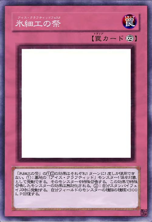 | 「氷細工の祭」の①②の効果はそれぞれ1ターンに1度しか使用できない。①:墓地の「アイス・クラフティッド」モンスター1体を対象として発動できる。そのモンスターを特殊召喚する。この効果で特殊召喚したモンスターの効果は無効化される。②:自分スタンバイフェイズ時に発動する。自分フィールドのモンスターの種族の種類×300LP回復する。 | |||