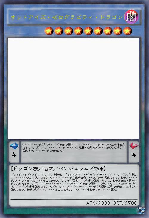 | 「オッドアイズ・アドベント」により降臨。「オッドアイズ・ゼログラビティ・ドラゴン」の①の効果は1ターンに一度しか使用できない。①:このカードが儀式召喚に成功した時に発動できる。相手フィールド上にセットされたカードを全て持ち主のデッキに戻す。この効果の発動に対して、相手は魔法・罠カードを発動できない。②:このカードがモンスターゾーンに存在する限り、相手は700LPを払わなければ、カードの効果を発動できない。③:モンスターゾーンのこのカードが戦闘・効果で破壊された場合に発動できる。相手のPゾーンのカードを全て破壊し、このカードを相手のPゾーンに置く。 | |||