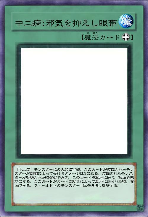 | 「中二病」モンスターにのみ装備可能。このカードが装備されたモンスターが戦闘によって受けるダメージは0になる。装備されたモンスターが破壊された時発動できふ。このカードを墓地に送り、破壊を無効にする。このカードがカードの効果によって墓地に送られた時、発動できる。フィールド上のモンスター1体を選択し破壊する。 | |||
