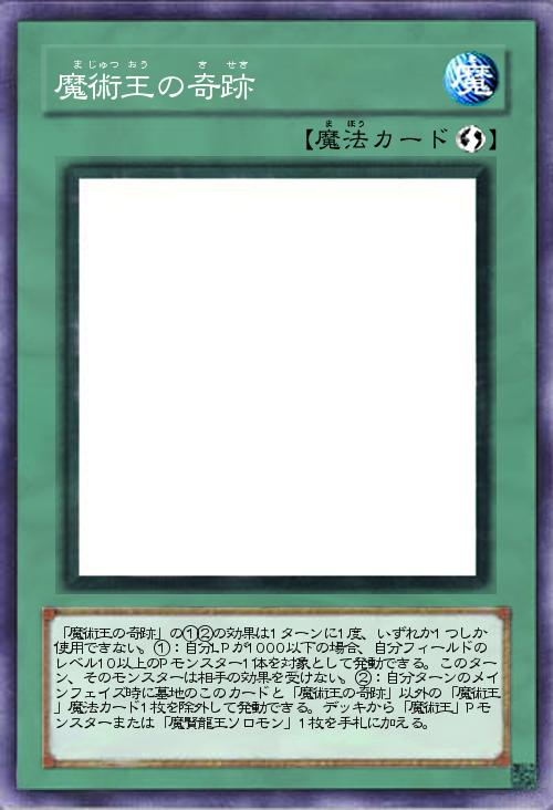 | 「魔術王の奇跡」の①②の効果は1ターンに1度、いずれか1つしか使用できない。①:自分LPが1000以下の場合、自分フィールドのレベル10以上のPモンスター1体を対象として発動できる。このターン、そのモンスターは相手の効果を受けない。②:自分ターンのメインフェイズ時に墓地のこのカードと「魔術王の奇跡」以外の「魔術王」魔法カード1枚を除外して発動できる。デッキから「魔術王」Pモンスターまたは「魔賢龍王ソロモン」1枚を手札に加える。 | |||
